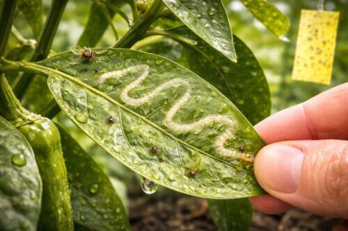 ハモグリバエの対策で最も重要なのは、「筋の先端をよく見る」ことです。白い筋の行き止まりの部分を透かして見ると、黄色っぽい小さな幼虫が透けて見えることがあります。そこを爪の先や指で「プニュッ」と押し潰すのが、最も確実で手軽な防除法です。薬剤を使いたくない場合でも、この作業を丁寧に行うだけで発生密度をかなり下げることができます。