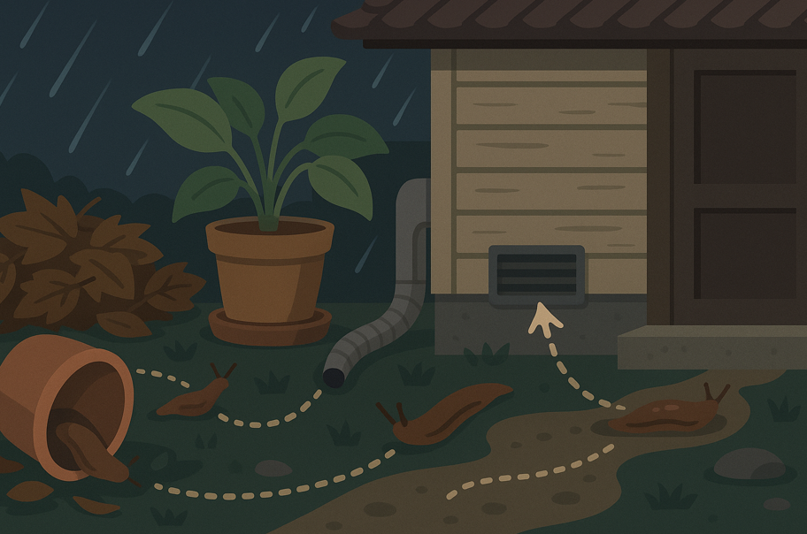 湿って暗い環境は、ナメクジの隠れ家・休息場所として最適です。日中は潜み、夕方〜夜間に移動・摂食が活発化するため、庭・外壁沿いから屋内への侵入が起こりやすくなります。