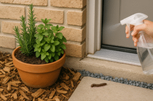 屋外では、落ち葉・雑草の除去、マルチ材やブロック下の点検、鉢をスタンドに乗せて底面を乾かす、土の表層を時折ほぐして通気を確保する、家の周囲を遮るように忌避剤を環状散布する、などが機能します。