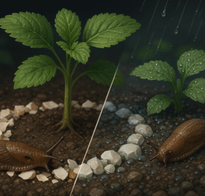 ナメクジは雌雄同体で、交尾後は双方が産卵できます。土中や鉢底、石の下など、湿って守られた空間に数十個単位の卵をまとめて産み付ける性質があり、条件がそろうと短期間で密度が上がります。屋外に近い床下や、鉢底の空隙、割れ鉢・レンガの下は小さな産卵サイトとして機能しやすい場所です。