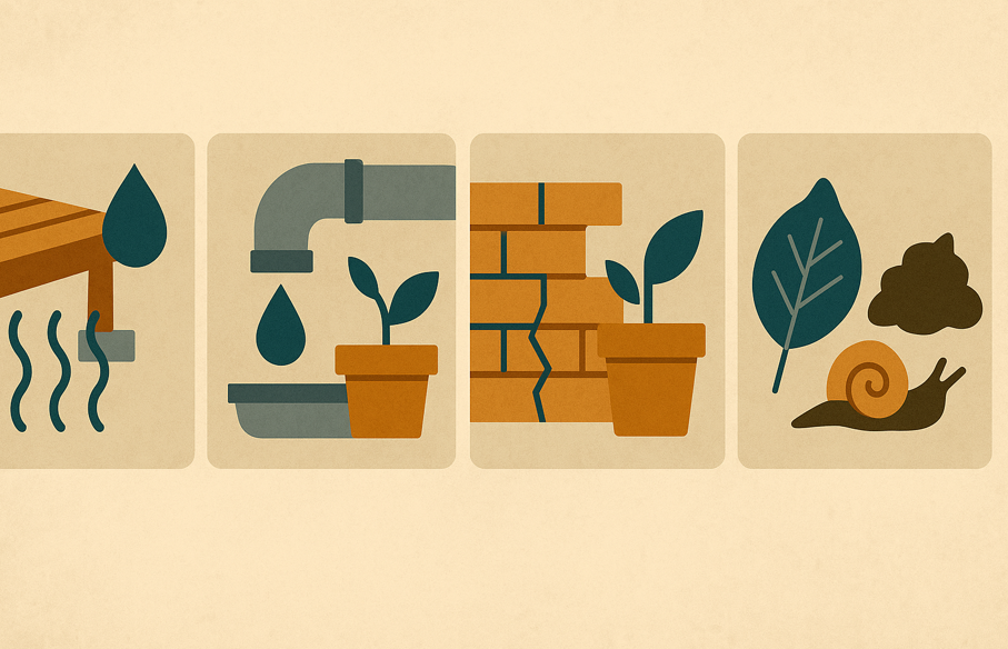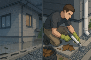 - 片づける:落ち葉・コケ・割れ鉢・木片・段ボールなどの「陰を作る物」を外壁際から退避し、家庭菜園の残渣を放置しない。ベランダ・玄関の目地は定期的にブラッシングして有機汚れを減らす