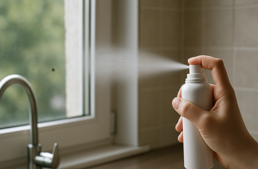 飛翔中ではなく、壁・天井・窓ガラスに静止したタイミングを狙い、30〜50cm程度まで距離を詰めて短い噴射で一点集中させると、実効的な付着量を確保しやすくなります。