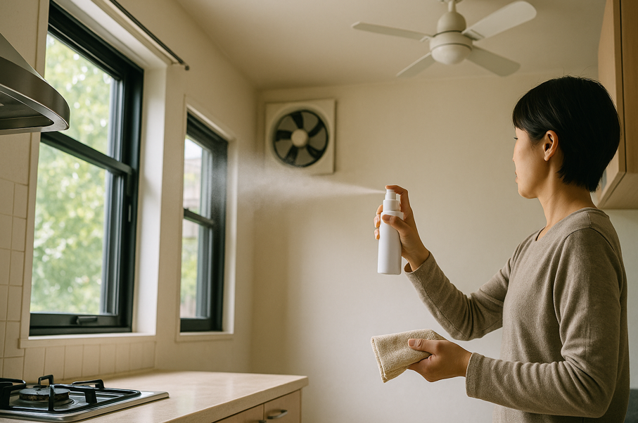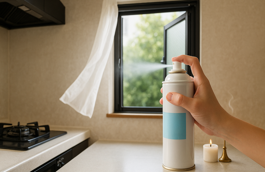 可燃蒸気対策は常に優先事項です。ガスコンロ、グリル、トースター、喫煙火、火花の出るスイッチ類の近くでは使用を控え、噴霧前後は換気を行います。