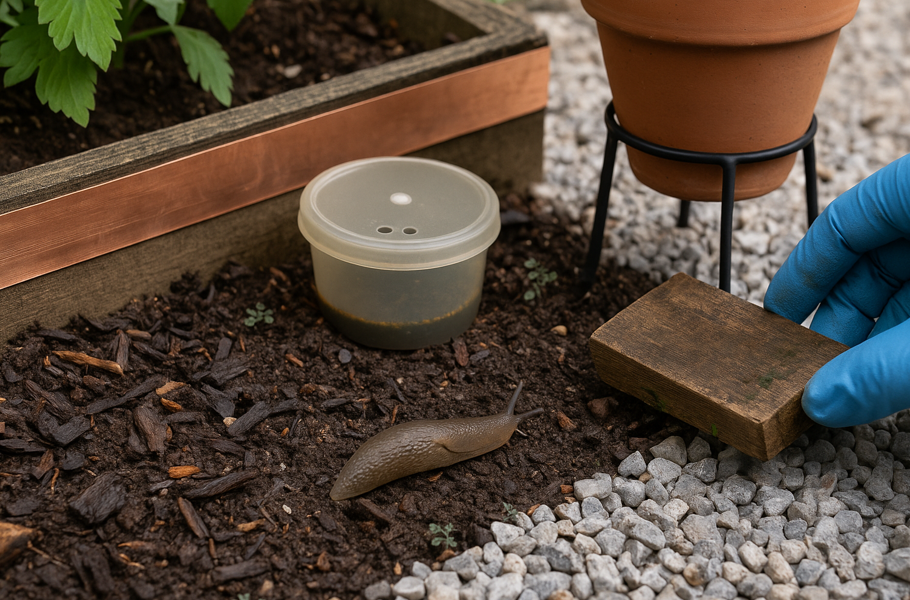 代替策としては、銅テープによる物理バリア、リン酸鉄系ベイトの適正配置、潜伏場所(落ち葉・空鉢・板材)の整理、夕方〜雨上がりの点検強化など、苦痛や二次汚染を抑えつつ被害を減らす手順が有効です。