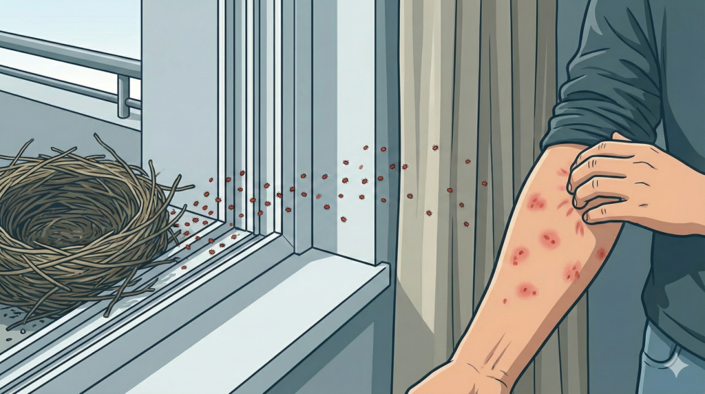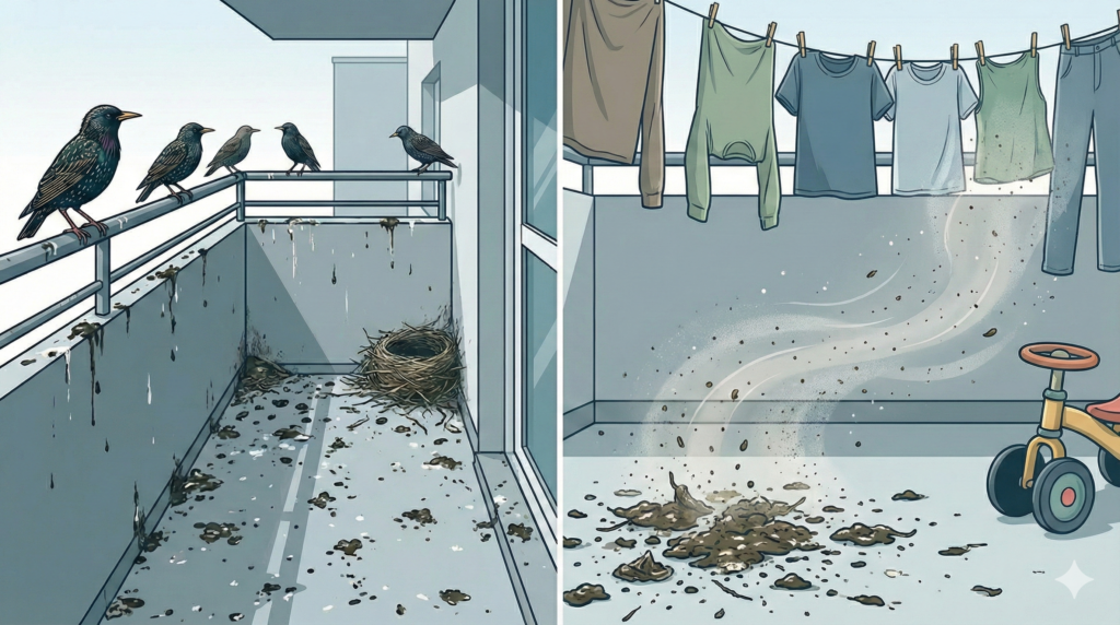 ムクドリのベランダ被害は、放置すると騒音だけでなく、フン由来の衛生不安やダニの二次被害に発展しやすいのが厄介です。