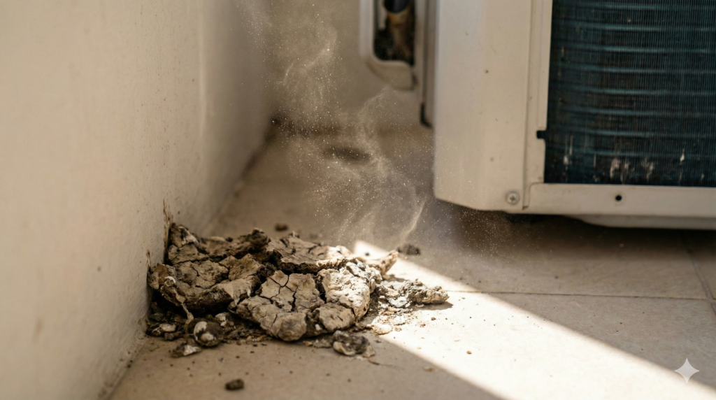 ベランダや換気口まわり、室外機の上などにフンが溜まっていると、掃除のタイミングで粉が舞いやすくなります。