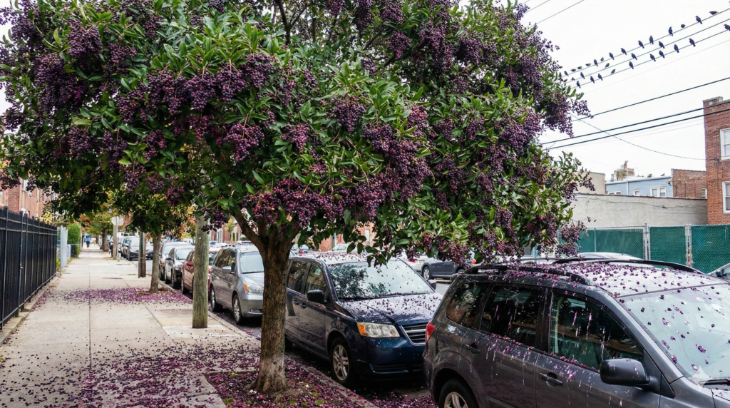 黒紫の実が目立つ+夕方に群れの鳴き声が増えるこの2つが揃ったら、紫フンは“時間の問題”です。