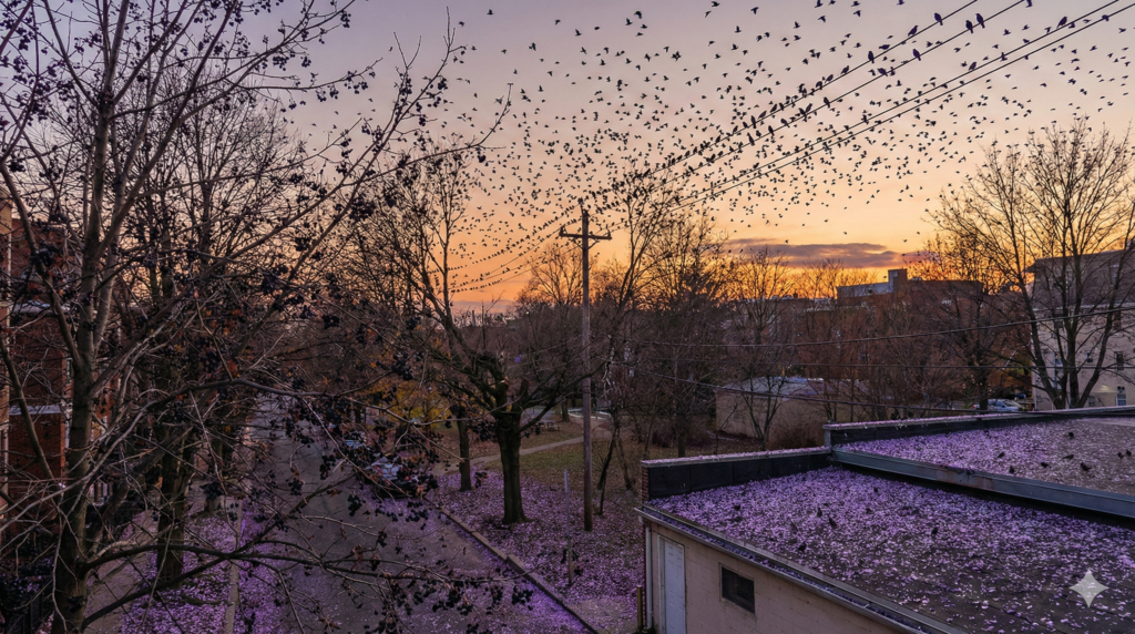 ねぐらの下で車や歩道が「一晩で紫だらけ」になるのは、ムクドリが群れで同じ場所に集まる習性の影響が大きいです。