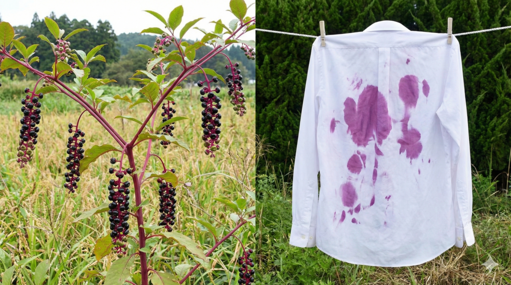 ヨウシュヤマゴボウ由来のフンは、赤紫寄りに見えることがあり、乾くと繊維や多孔質素材に色が残りやすい傾向があります。