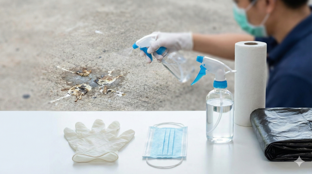 だから順番は決まっています。①湿らせる、②回収する、③洗浄する、④必要に応じて消毒する。この流れを守るだけで、体へのリスクも、汚れの広がりも抑えられます。