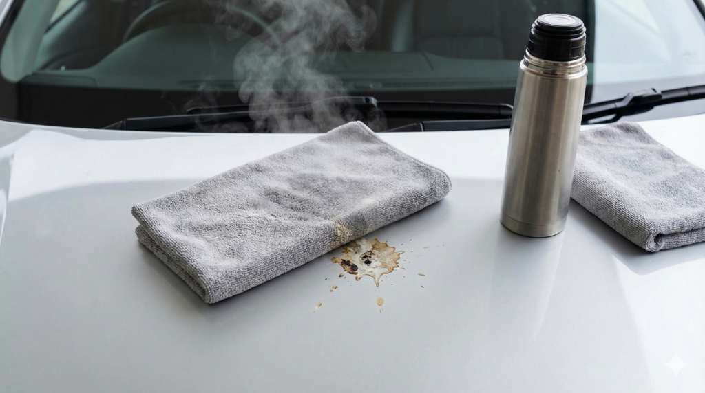 やり方は単純で、熱湯を直接ボディにぶっかけるのではなく、マイクロファイバーを熱めのお湯で温めてから、フン跡に数分“湿布”するイメージです。