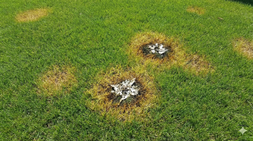また、糞が分解すると窒素が局所的に濃くなり、芝が焼けるように傷むことがあります。