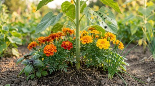 ひまわりと最も相性が良いとされるのがマリーゴールドです。マリーゴールドの根からは、土壌中の有害なセンチュウ(根を腐らせる微小な虫)を駆除する成分が分泌されます。また、その独特な強い香りは、ひまわりを狙うアブラムシやコナジラミ、さらには一部の害虫の成虫が飛来するのを防ぐ忌避効果を発揮します。見た目もひまわりと同じ暖色系で相性が良く、花壇の足元を彩りながら守ってくれる頼もしい存在です。
