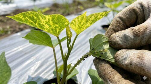 アブラムシは葉裏や新芽に付きやすく、数そのものよりもウイルス病を運ぶ媒介虫として警戒したい相手です。サツマイモではモザイク症状が出ると生育が鈍り、つるの伸び方も葉色も乱れやすくなります。見た目の問題だけでなく、塊根の太りにも響きます。