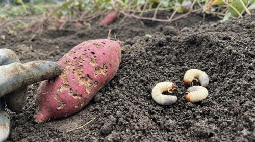 サツマイモで見落とされやすいのがコガネムシ幼虫です。いわゆるジムシによる被害は、収穫して初めて気づくことが多く、塊根の表面があばた状になったり、浅くえぐられた跡が残ったりします。見た目の問題だけで済まず、傷口から腐敗が進みやすくなるため、家庭菜園でも商品性でも大きな痛手になりがちです。