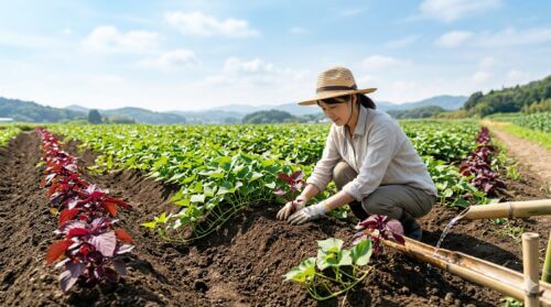 特にコガネムシ被害が気になる畑では、畝間や周辺に赤しそを点在させるだけでも、無対策より管理しやすくなります。私は、赤しそを万能薬のようには考えませんが、つるぼけ抑制と害虫対策を同時に狙える点で、無農薬と非常に相性がよいと見ています。