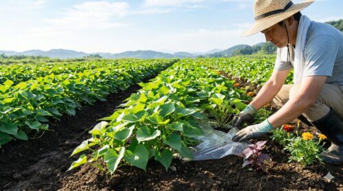 黒マルチも有効な組み合わせです。土の乾きすぎや雑草抑制だけでなく、成虫の産卵機会を減らす方向に働きやすいからです。ただし、マルチを敷けば絶対に防げるわけではありません。周辺に雑草や有機物が多い、前年の被害残渣が残っている、収穫が遅れて土中滞在期間が長くなるといった条件が重なると、被害は出ます。結局のところ、マルチ・土づくり・適期収穫をまとめて考えることが、無農薬でコガネムシ幼虫と付き合う現実的な方法です。