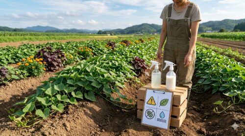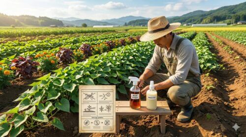散布するなら、涼しい時間帯にラベルや使用条件を必ず確認し、作物への影響を見ながら小さく試すのが安全です。特に畑で使う製品は用途範囲に注意が必要です。資材選びに迷う場合や、作物への影響が不安な場合は、園芸店や普及指導機関など専門家に相談するのが確実です。