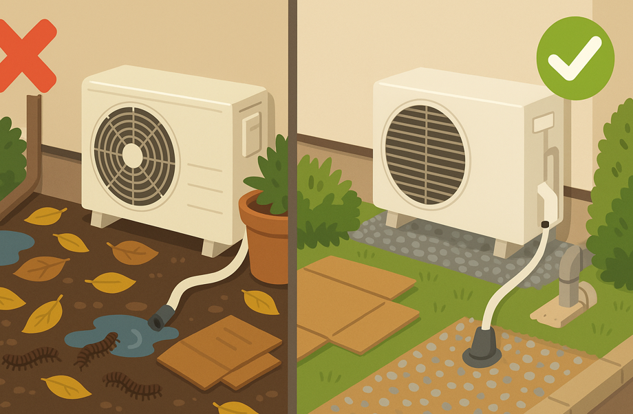 - ドレンホース:地面や植栽と接しないよう先端を5〜10cm浮かせ、逆勾配がないかを確認します。月1回程度、ホース内に溜まるスライム(ぬめり)を排水クリーナーや温水で流し、排水性を保つと遡上リスクを下げられます。完全密閉の栓は厳禁で、通水性を確保する防虫キャップを選びます。