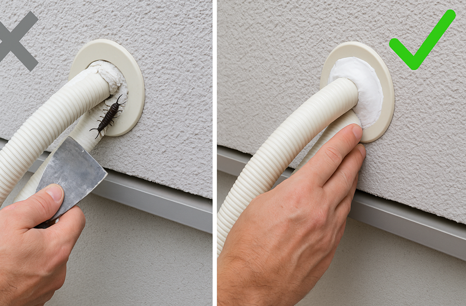 高リスクでは、まずドレンホース先端の位置と勾配、貫通パテの補修、防虫キャップの装着を同時に実施し、室内側はフィルター清掃と送風乾燥の運用に切り替えます。屋外は落ち葉・資材の撤去と水はけ改善で誘引源を削減します。