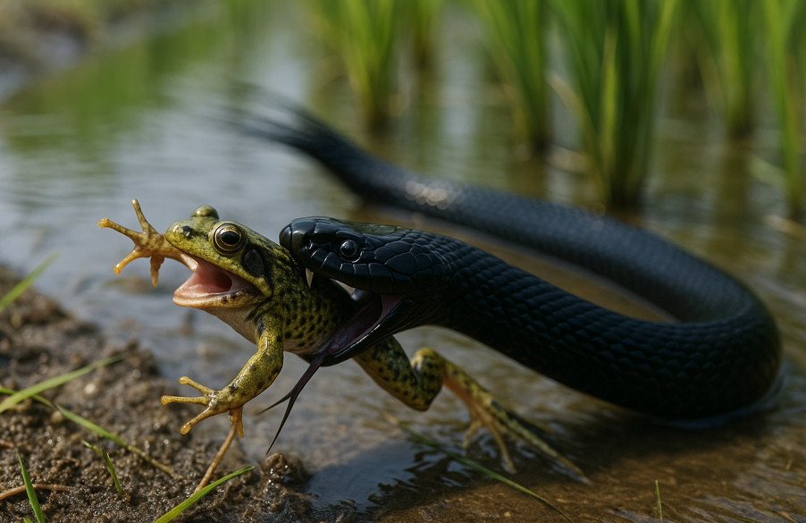 シマヘビの黒化個体であれば、主食はカエル類が中心で、小型の魚やトカゲ、時に小型哺乳類を捕らえることがあります。