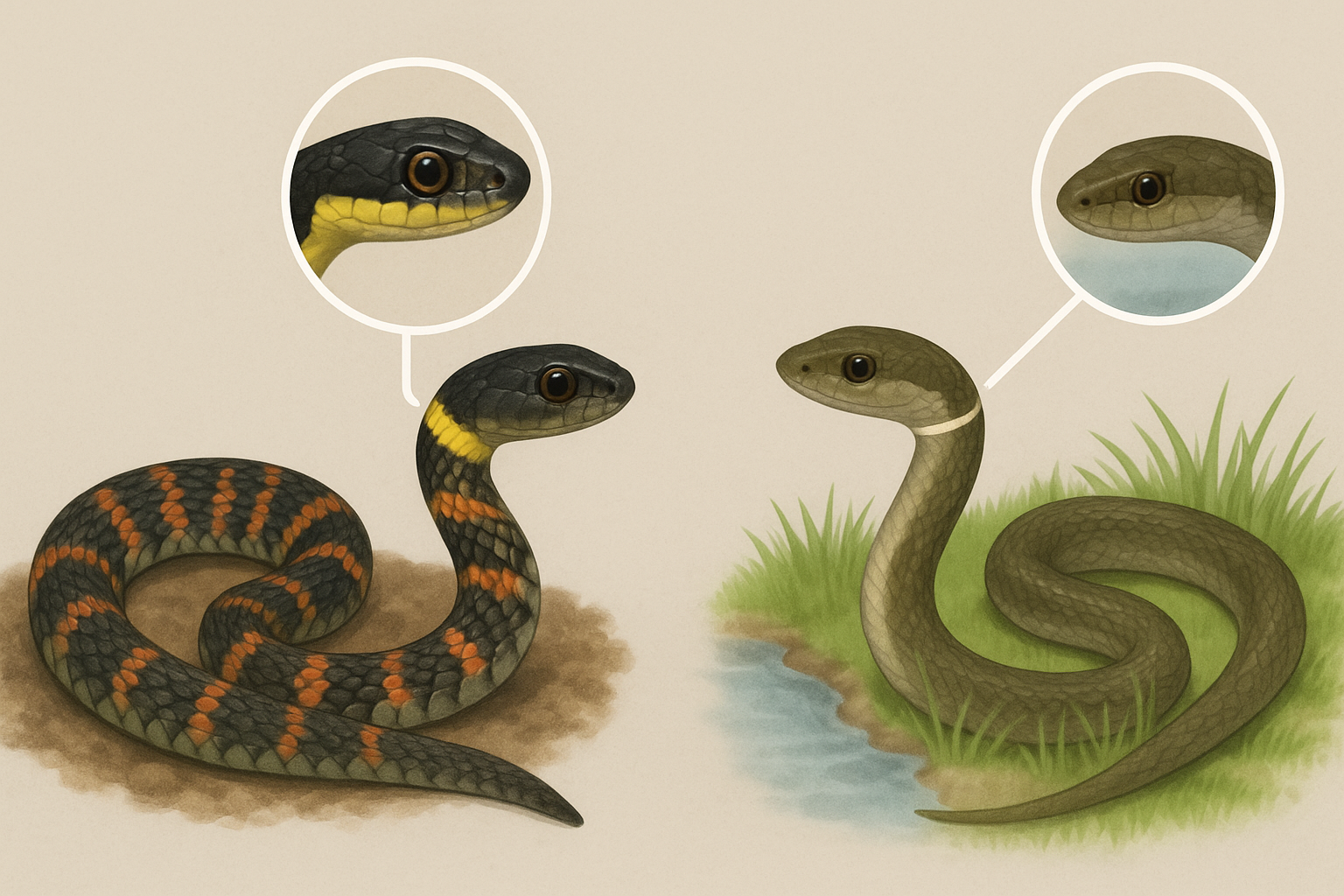 ヒバカリは無毒で水辺に現れ、サイズ感や生息環境が近いため誤認が起こりやすい相手です。