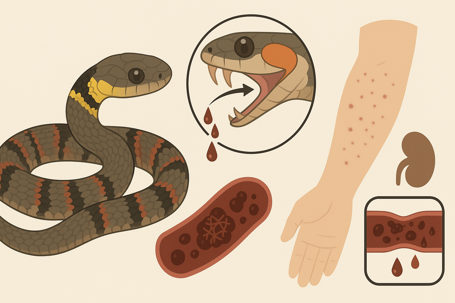 咬毒が体内へ入れば、プロトロンビン活性化→凝固因子枯渇→出血傾向という流れで凝固障害が進行する可能性があるため、局所が軽くても早期受診が安全です。