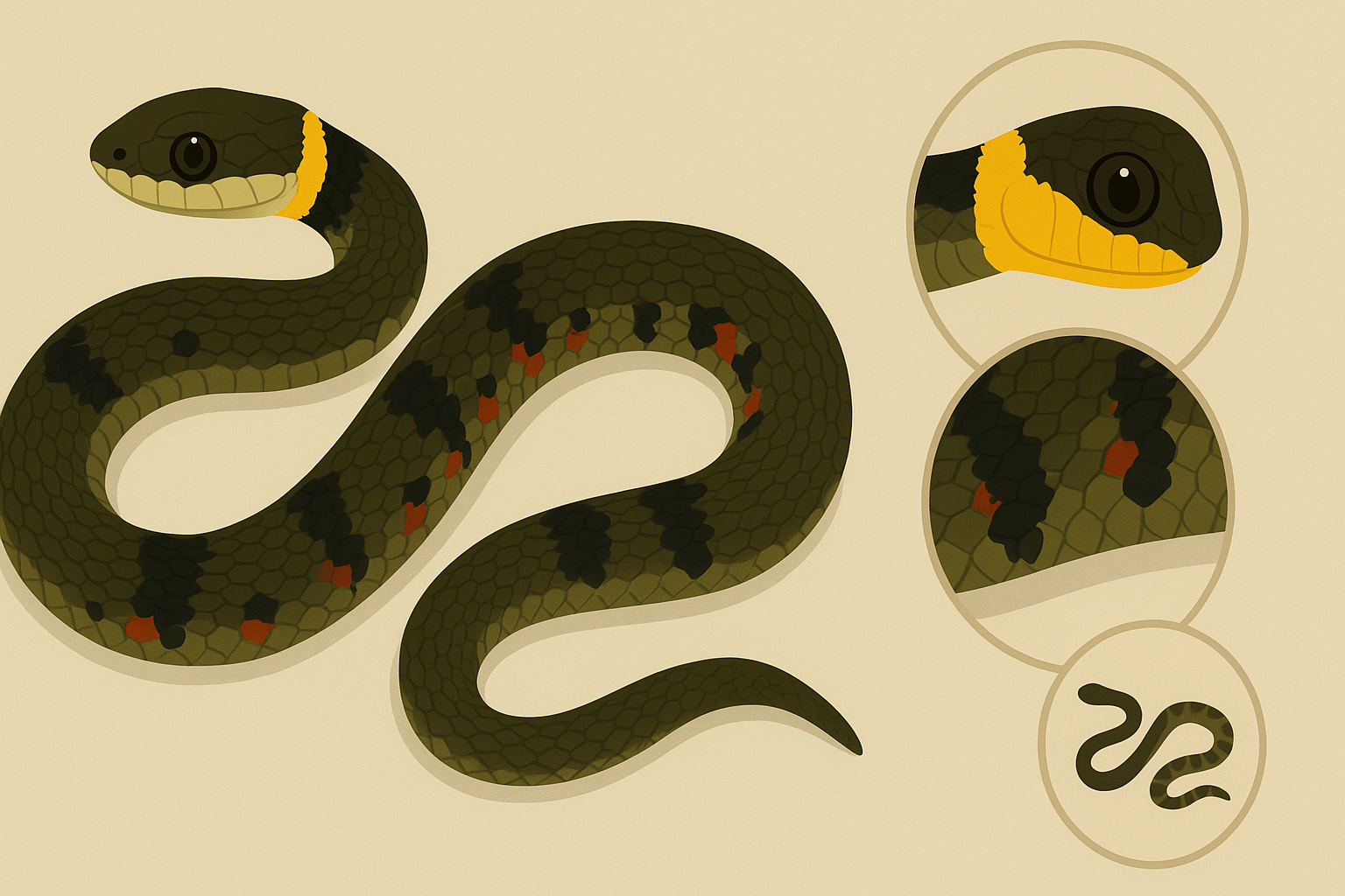 幼体では頸部の黄色い帯模様(首輪)が最も目立つ識別点です。