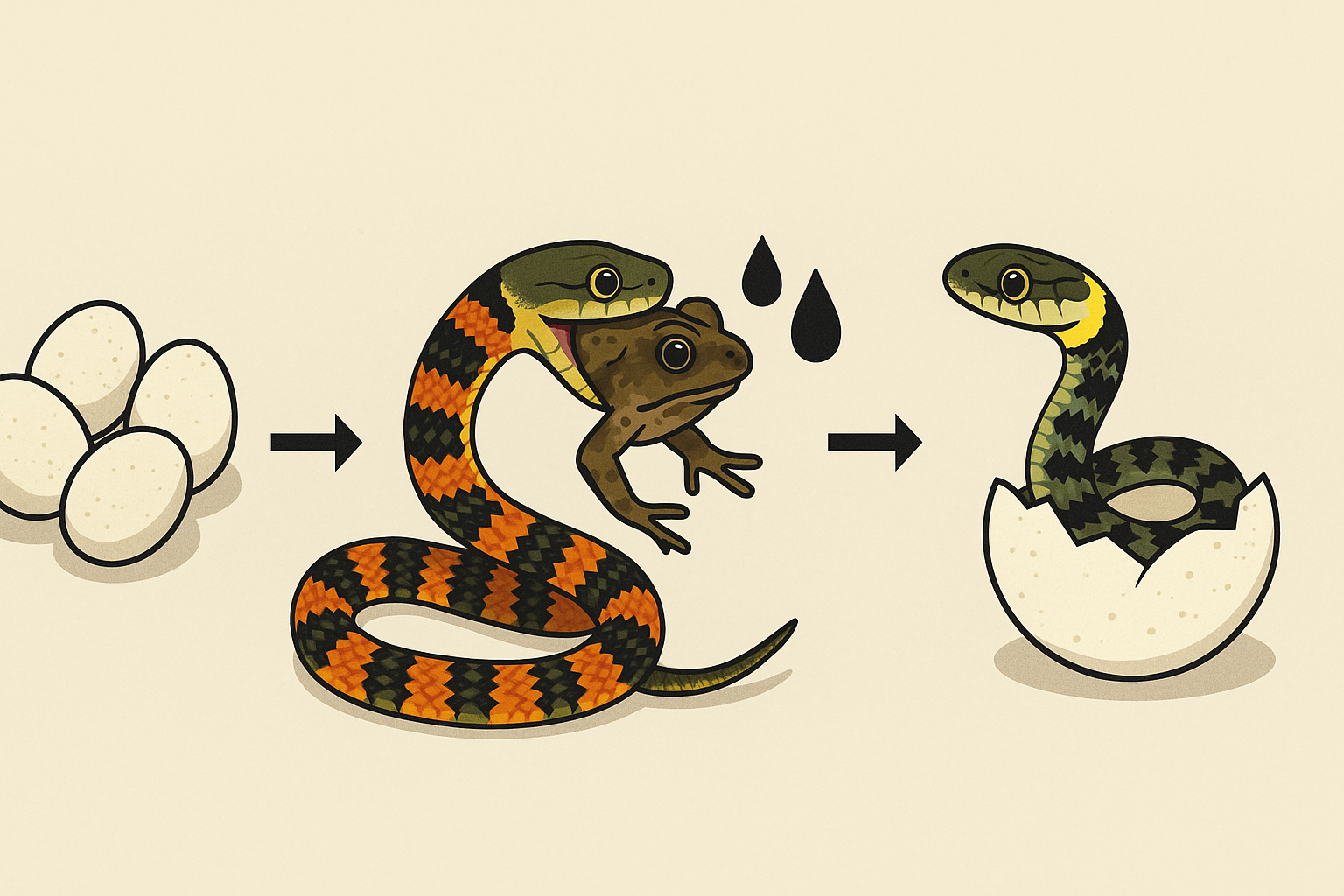 具体的には、母蛇が捕食したヒキガエル由来の成分が卵黄に移行し、孵化したての幼体でも頸部背面に並ぶ頸腺に防御物質が蓄えられます。