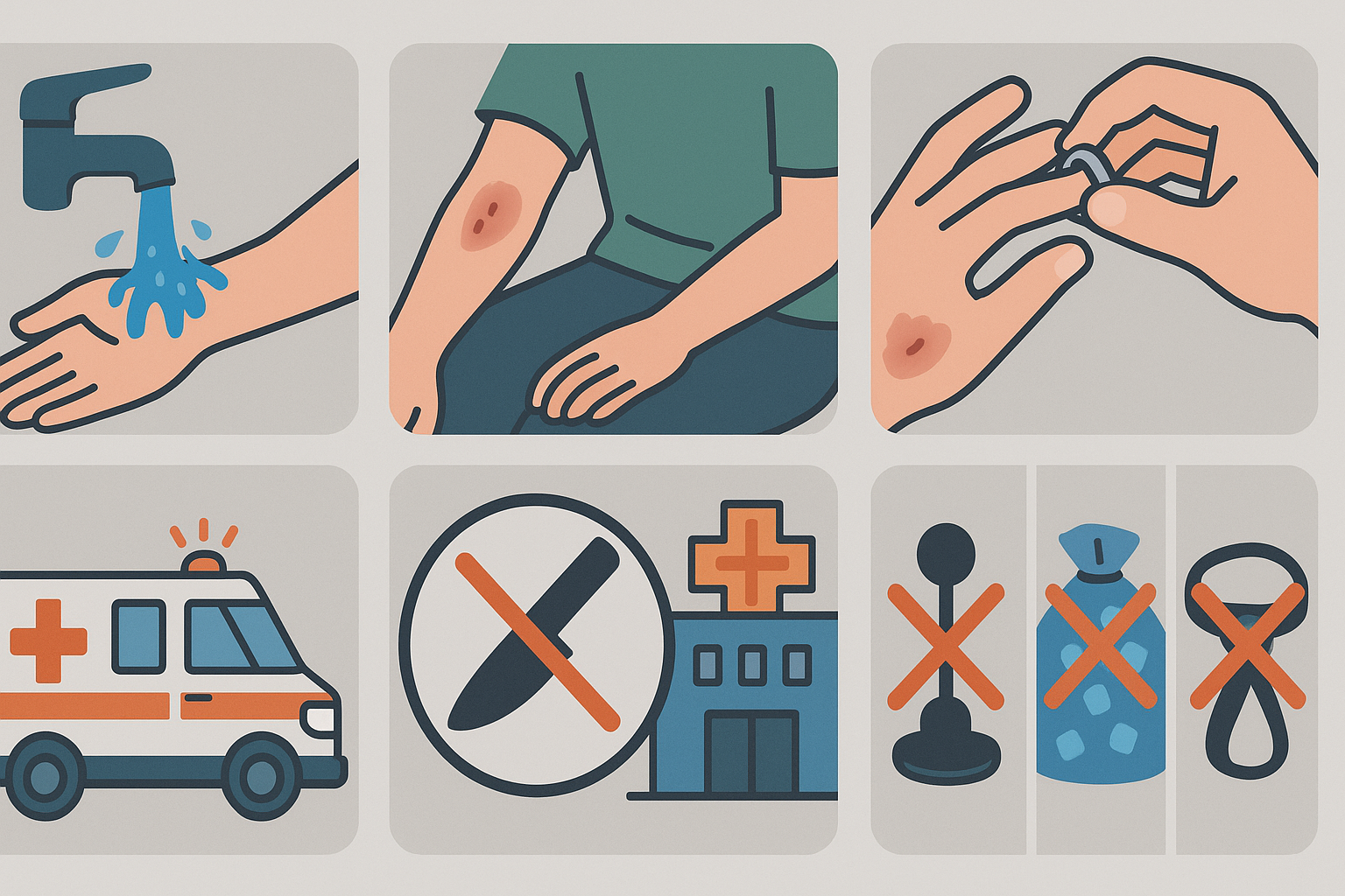 最優先は速やかな受診です。まず流水でやさしく洗い、患肢を心臓よりやや低く保って安静にします。