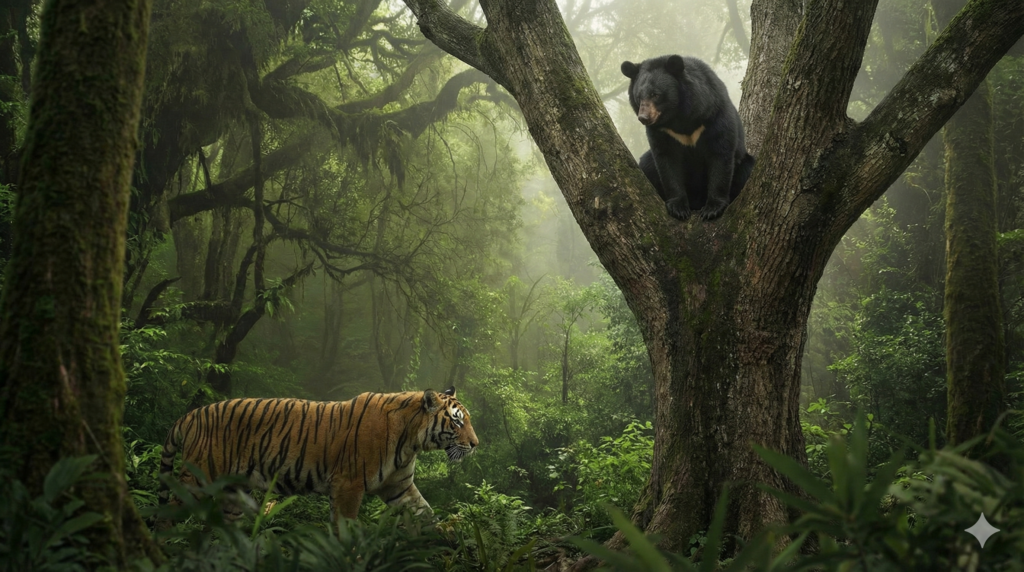 ツキノワグマの模様の意味を考えるとき、どうしても外せないのがトラとの関係です。