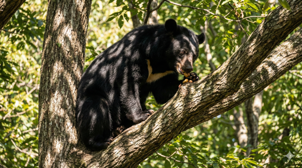 樹上生活が得意なツキノワグマは、木漏れ日の差し込む森の中で暮らしています。