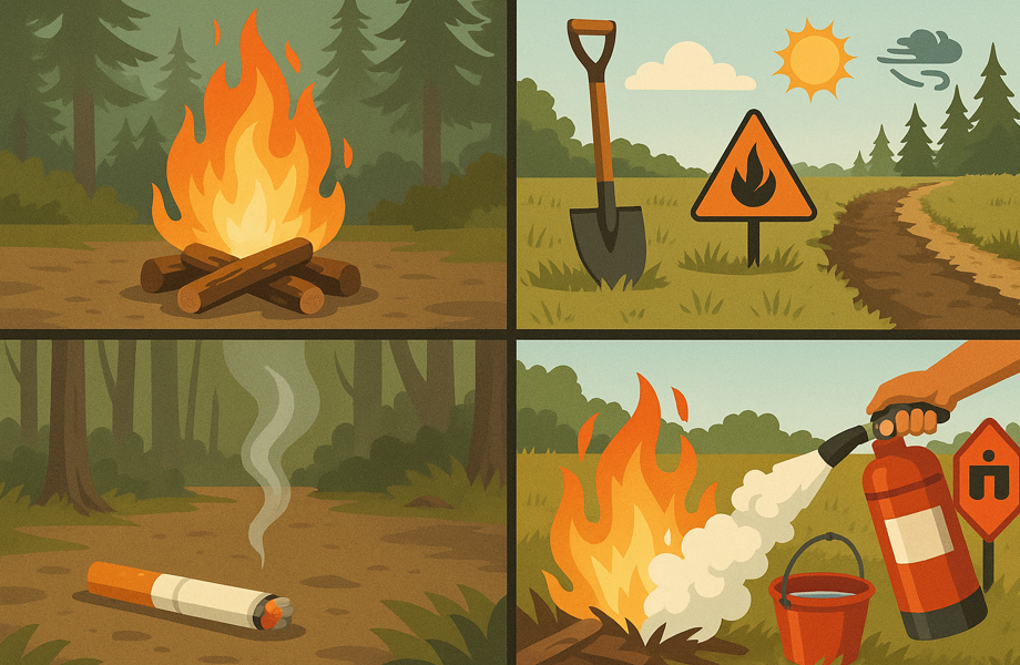 たき火・バーベキュー | 残り火の放置 | 乾燥・強風・高温 | 完全消火と水浸し、灰の不燃容器保管 |
