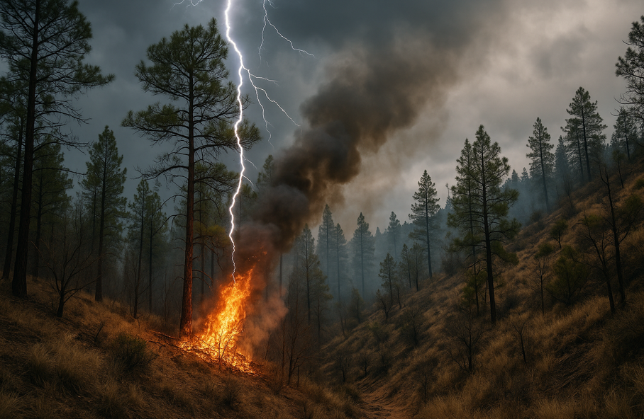 乾燥した可燃物の表層に雷撃が加わると、炭化と余熱が残り、くすぶりが風で酸素供給を受けて炎に転じます。