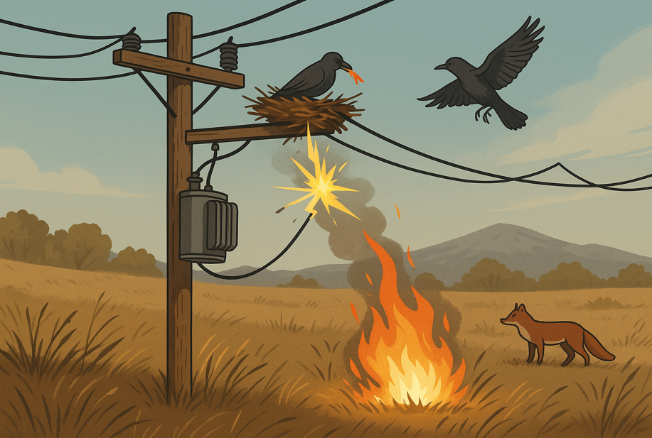 鳥が電線に絡んだり、巣材が設備に触れて火花が出るといったインフラ関連の報告はありますが、動物そのものが自発的な発火源になる事例は限定的とされています。