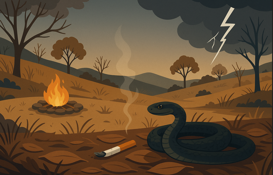 ここで扱う山火事の原因という観点では、これらのヘビが火源を作るとの根拠は示されていません。