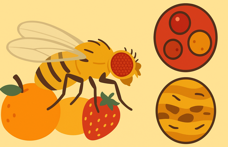 果物や発酵食品を好むショウジョウバエでは、摂取した色素や体表の赤褐色の色調が混ざり、赤っぽく見えることがあります。
