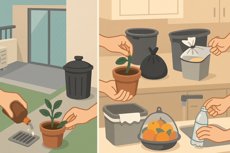 屋内では、ゴミ袋の口を確実に結ぶ、空き缶やペットボトルをすすぐ、液だれした調味料を拭き取るなど、小さな積み重ねが効果を発揮します。