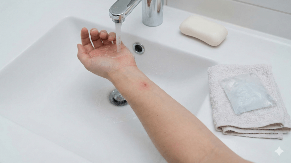 応急処置でやりがちな失敗が、アルコールを強く擦り込むこと。刺激で皮膚が荒れると、かえって痛みが長引くことがあるので、まずは“洗う・冷やす”を優先してください。