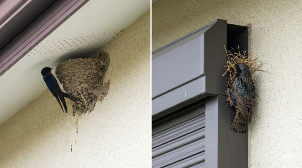 ツバメは人の出入りがある場所に巣を作り、比較的「共存」しやすいケースが多い一方、ムクドリは戸袋・換気口・屋根の隙間など、生活動線の近くや建物の弱点に入り込みやすい傾向があります。