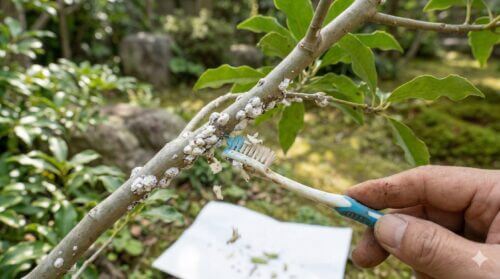 成虫になったカイガラムシのように、強固なロウの殻で守られている相手には、最新の殺虫剤よりも「使い古した歯ブラシ」の方が遥かに高い効果を発揮することがあります。物理的に虫体を枝から剥がし取ることは、即効性があり、かつ環境負荷がゼロの優れた防除法です。特に小規模な発生であれば、この方法だけで十分に解決可能です。
