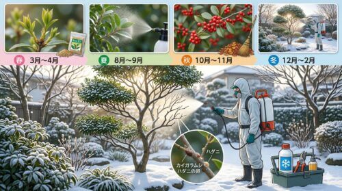 ソヨゴを1年中美しく保つためには、場当たり的な対応ではなく、季節の移ろいに合わせた「先回り」のスケジュール管理が必要です。害虫が活動を開始してから慌てるのではなく、彼らが眠っている間、あるいは発生の初期段階で叩くことが、最も効率的で木への負担も少ない管理方法です。