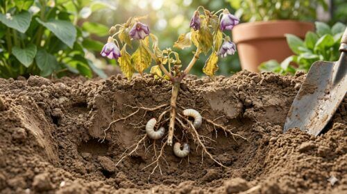 根を食害して株を枯らすコガネムシの幼虫