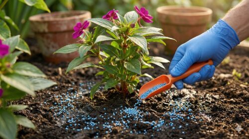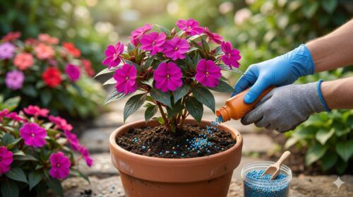 代表的な薬剤である「オルトラン粒剤」や「ベストガード粒剤」は、植え付け時に土に混ぜ込む(混和)か、生育中に株元にパラパラと撒くだけで完了します。一度の散布で約1ヶ月間、防除効果が持続するため、忙しいガーデナーでも管理が非常に楽になります。サンパチェンスは非常に成長が早いため、新しい葉が次々と展開します。その新芽を守るためにも、定期的な追肥のタイミングに合わせて粒剤を追加散布するのが賢いやり方です。