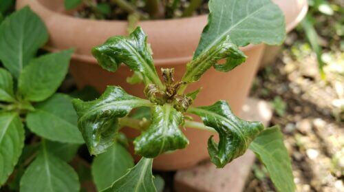 アブラムシの最も恐ろしい役割は、ウイルス病を媒介することです。一度ウイルスに感染したサンパチェンスは、現代の科学でも治療することができず、他の植物への感染を防ぐために株ごと廃棄するしかありません。