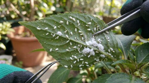 葉裏に潜む白いコナジラミとコナカイガラムシ