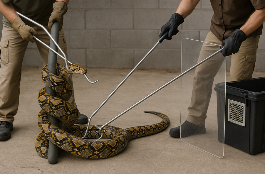 - 大型個体は複数人と専用器具で安全に保定するのが前提