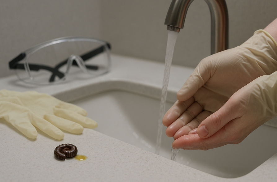 ムカデは咬傷リスクがあるため、素手接触は避け、長柄のピンセットや厚手手袋を用いるのが無難です。屋内での遭遇時は、凍結スプレーなどの非可燃冷却噴霧を選ぶと、薬剤飛散を抑えつつ動きを止めやすくなります。片付け後は換気と清掃を行い、侵入経路(サッシすき間、通気口、排水経路)を点検しましょう。