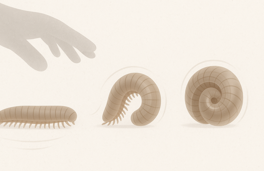 落ち葉層や鉢底のすき間に潜むヤスデは、外的刺激を危険と判断した瞬間、体節を素早く巻き込んで渦状(コイル状)に縮こまります。
