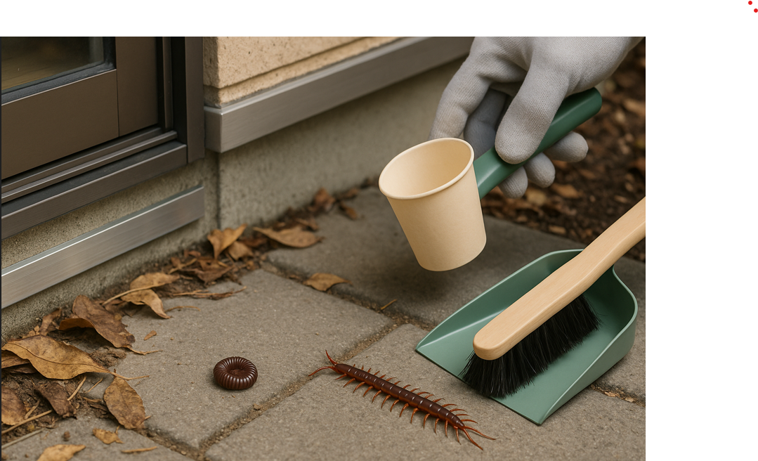 ムカデは咬傷リスクがあるため、素手接触は避け、長柄のピンセットや厚手手袋を用いるのが無難です。屋内での遭遇時は、凍結スプレーなどの非可燃冷却噴霧を選ぶと、薬剤飛散を抑えつつ動きを止めやすくなります。片付け後は換気と清掃を行い、侵入経路(サッシすき間、通気口、排水経路)を点検しましょう。